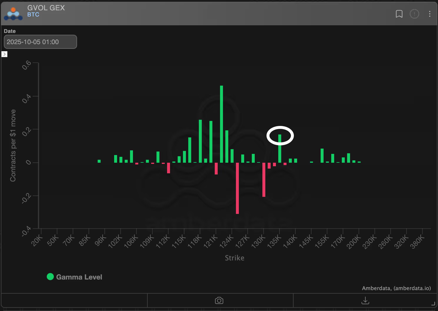 Pokud se bitcoinu podaří nad tímto rozmezím udržet, pozornost se přesune k další klíčové úrovni – 135 000 USD. Právě na této ceně drží tvůrci trhu výrazné dlouhé pozice v tzv. gamma expozici, což znamená, že při růstu mají tendenci prodávat a při poklesu nakupovat, aby udrželi neutrální pozici. Tento typ obchodování může krátkodobě tlumit volatilitu a vytvořit tak cenový strop, který by mohl bránit dalšímu růstu.