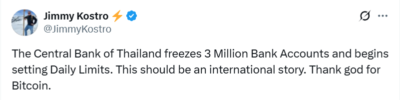 Velkou pozornost vzbudila i zpráva z Thajska, kde policie kvůli rozsáhlému podvodnému schématu nechala zmrazit asi tři miliony bankovních účtů. Kromě podezřelých účastníků postihly kroky i běžné zákazníky. V kryptokomunitě se objevily hlasy, že právě to ukazuje na výhodu bitcoinu jako alternativy, i když používání kryptoměn pro platby je v zemi zatím nelegální.
