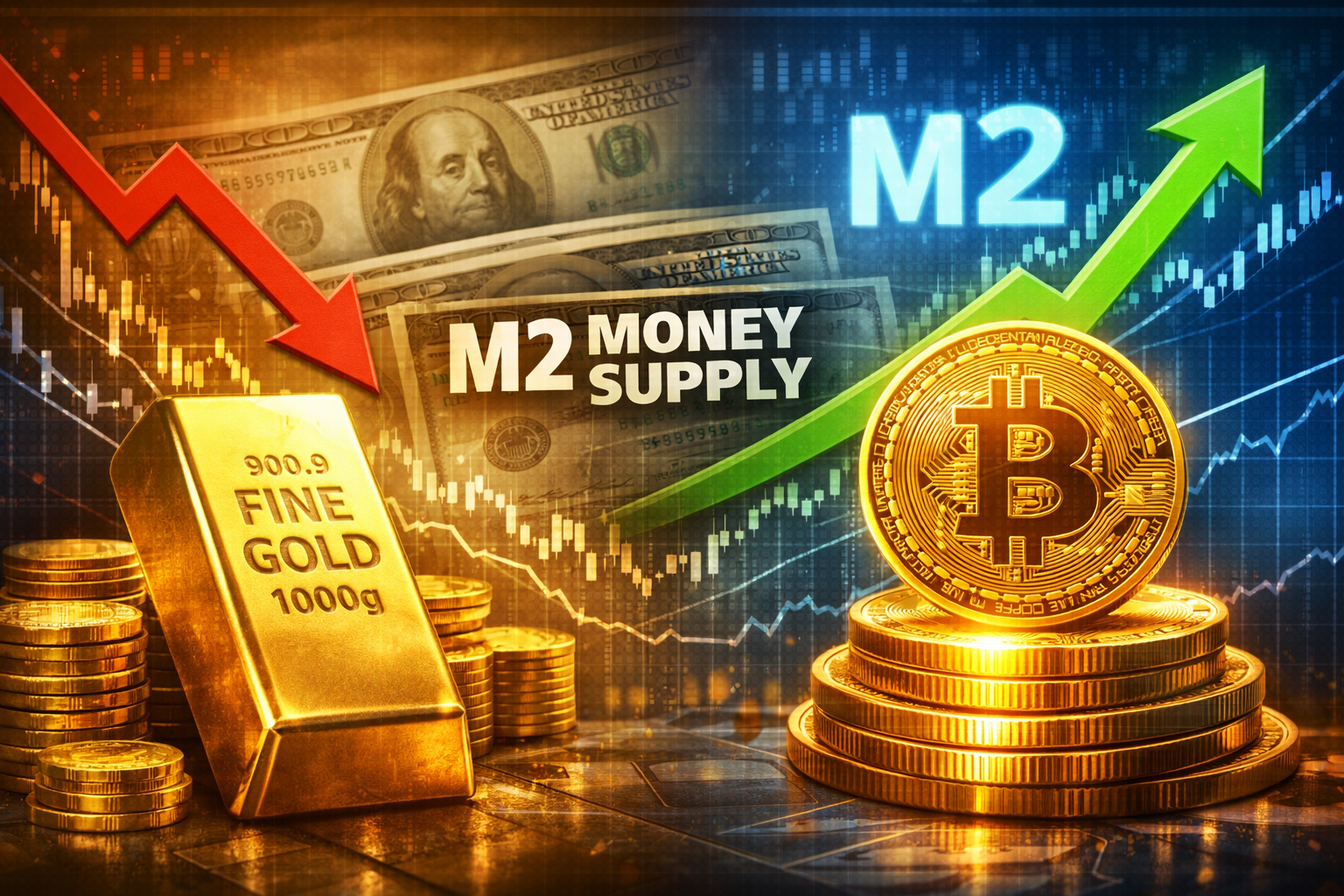 Zlato má za sebou silný rok. Od začátku roku 2025 jeho cena vzrostla o 38 procent, čímž překonala zhruba 23% zhodnocení bitcoinu. Tento pohled ale zachycuje jen část příběhu. Při srovnání obou aktiv s vývojem široké peněžní zásoby v USA, známé jako M2, se jejich dlouhodobý výkon výrazně liší.